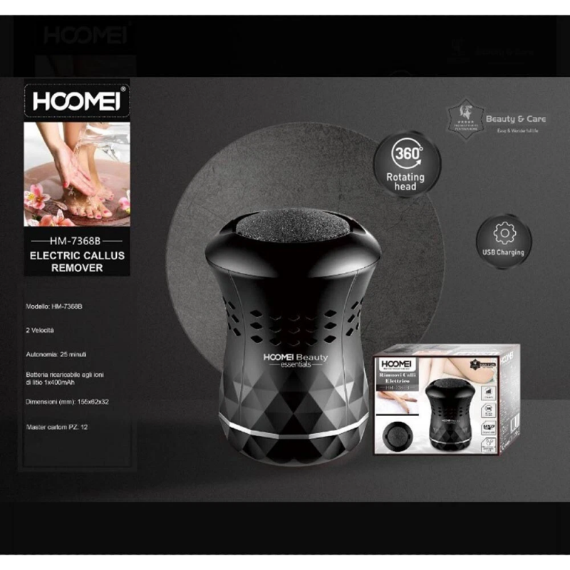 rimuovi calli elettrico progettato per offrire un trattamento efficace e pratico per la cura dei piedi. Con due velocità regolabili e una testina rotante a 360°, è ideale per rimuovere calli e pelle morta in modo sicuro e confortevole.